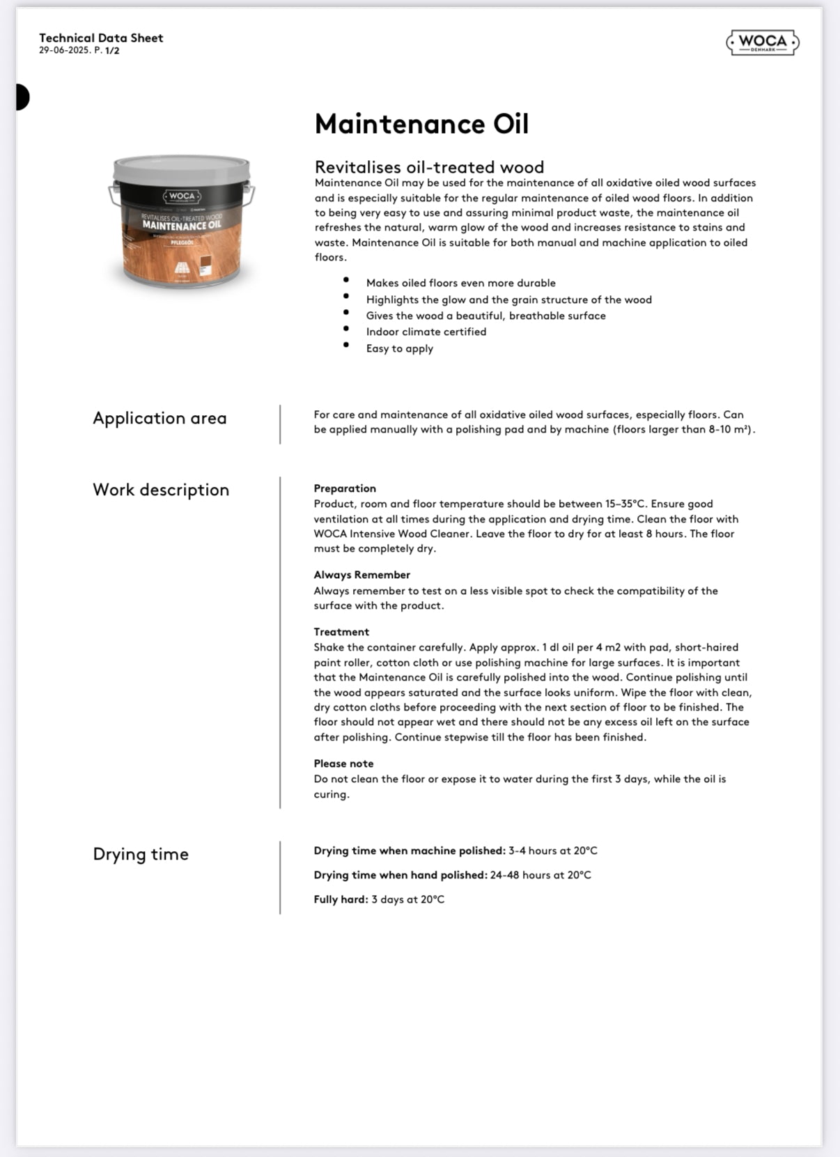 Maintenance Oil may be used for the maintenance of all oxidative oiled wood surfaces and is especially suitable for the regular maintenance of oiled wood floors. In addition to being very easy to use and assuring minimal product waste, the maintenance oil refreshes the natural, warm glow of the wood and increases resistance to stains and waste. Maintenance Oil is suitable for both manual and machine application to oiled floors.